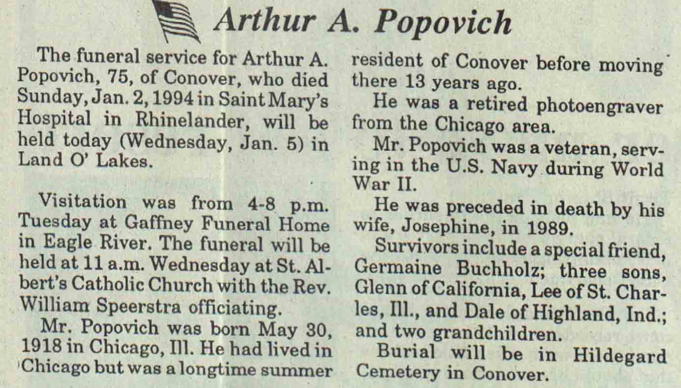 | Popovich | Arthur A | 30 May 1918 | 02 Jan 1994 | V N-R | 05 Jan 1994 | 4 |
