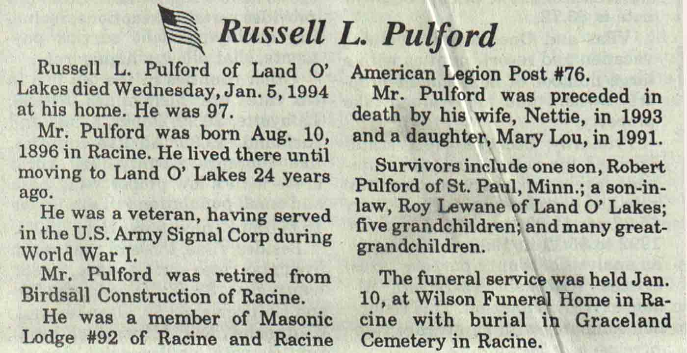 | Pulford | Russell L | 10 Aug 1896 | 05 Jan 1994 | V N-R | 12 Jan 1994 | 8 |