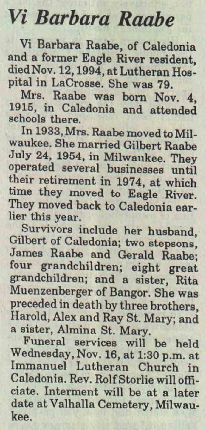 | Raabe | Vi Barbara (St. Mary) | 04 Nov 1915 | 12 Nov 1994 | V N-R | 16 Nov 1994 | 4 |