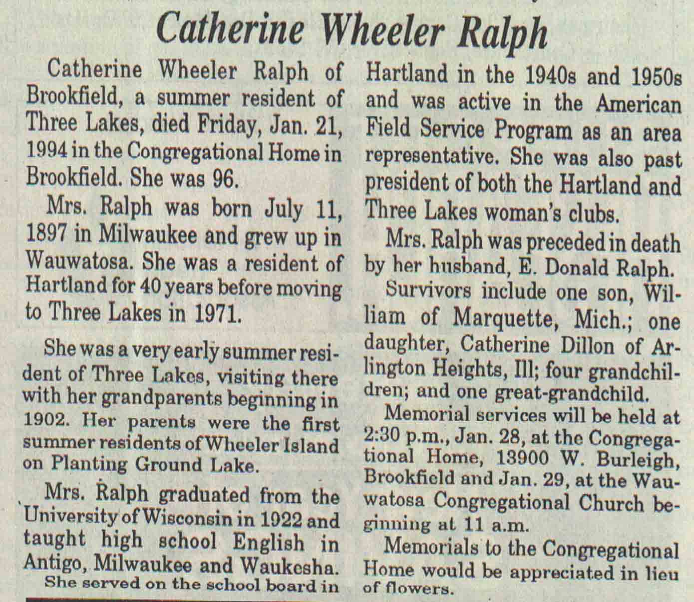 | Ralph | Catherine Wheeler #1 | 11 Jul 1897 | 21 Jan 1994 | V N-R | 26 Jan 1994 | 4 |