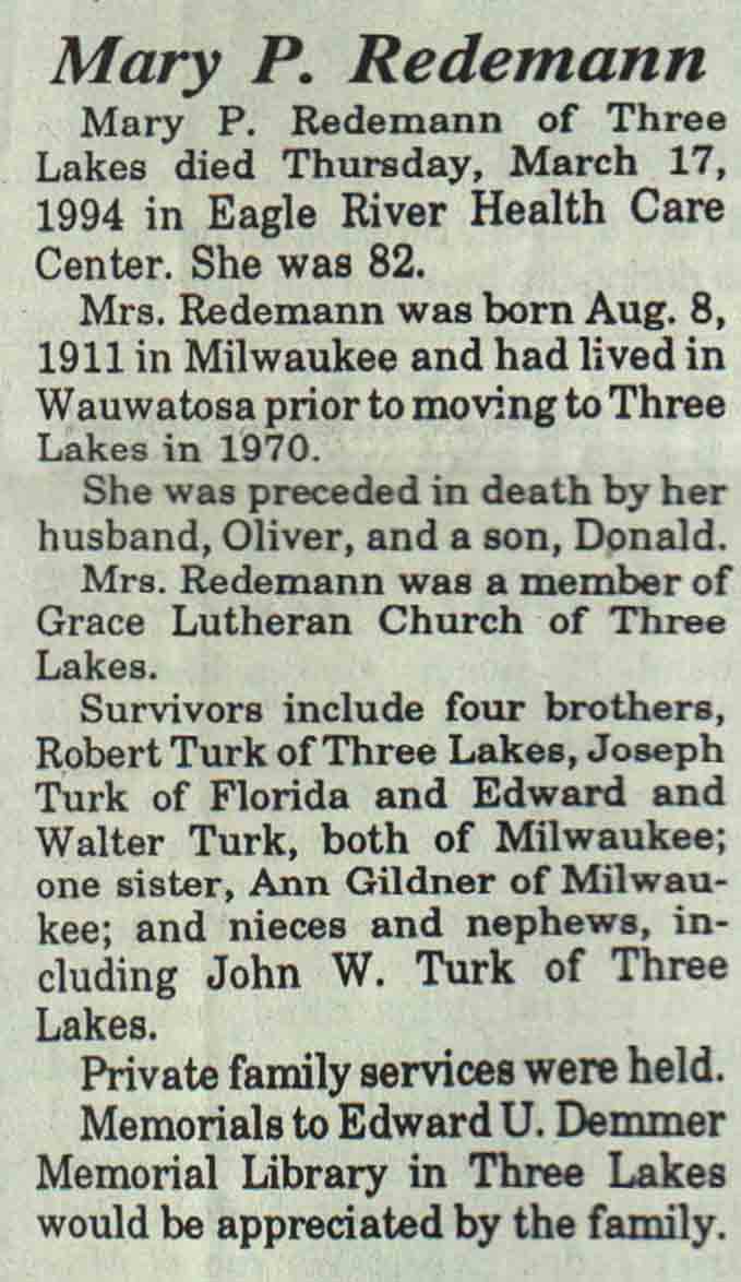 | Redemann | Mary P (Turk) | 08 Aug 1911 | 17 Mar 1994 | V N-R | 23 Mar 1994 | 4 |