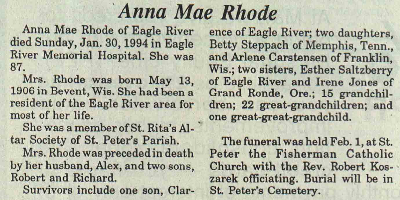 | Rhode | Anna Mae | 13 May 1906 | 30 Jan 1994 | V N-R | 02 Feb 1994 | 4 |