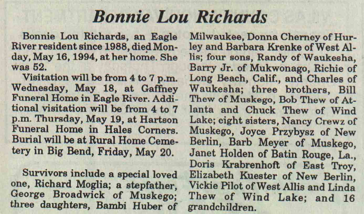 | Bellmore | Lomira Ann (Petts) | 02 Nov 1952 | 11 Feb 1994 | V N-R | 16 Feb 1994 | 4 |