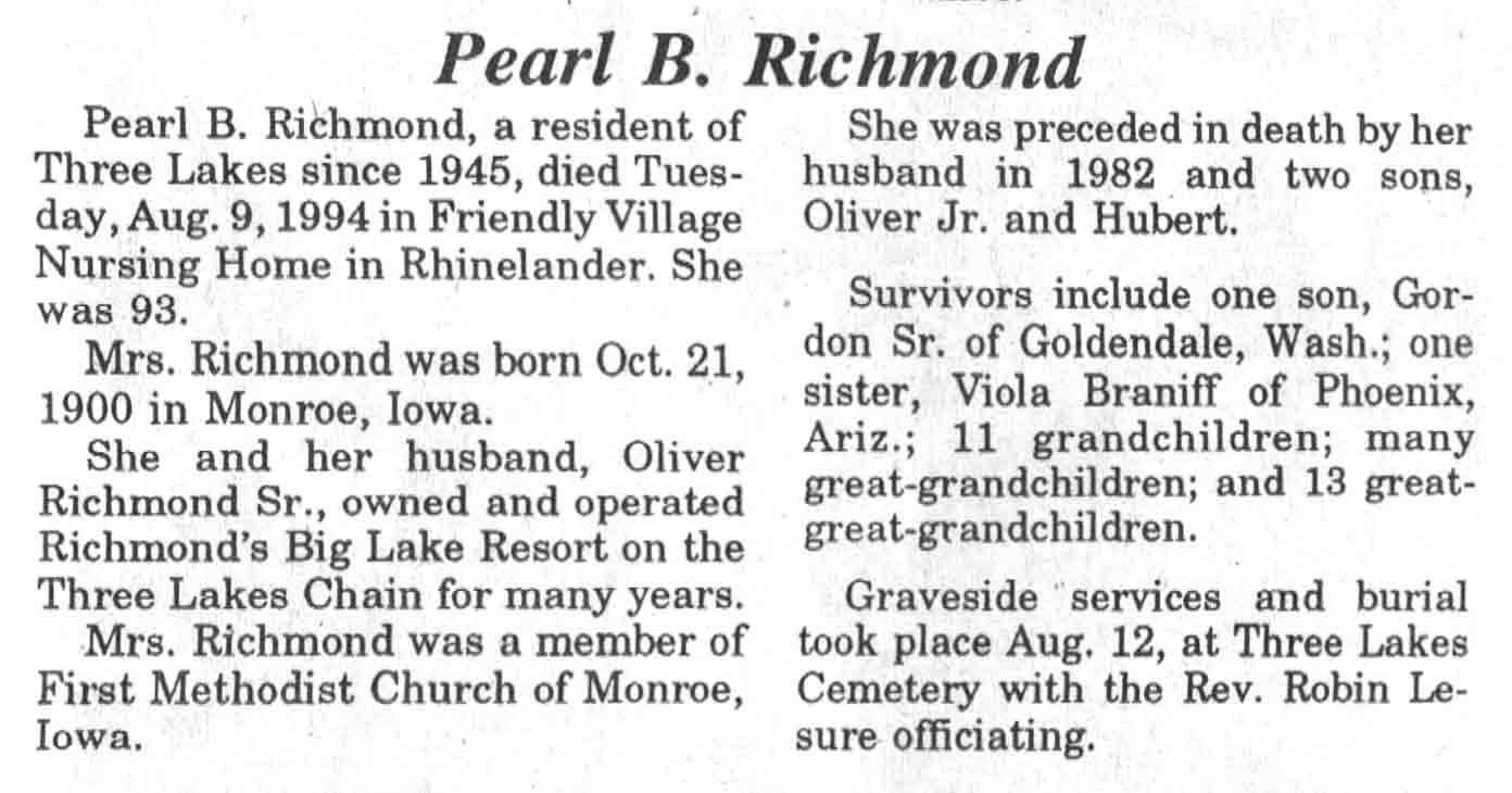 | Richmond | Pearl B | 21 Oct 1900 | 09 Aug 1994 | V N-R | 17 Aug 1994 | 4 |