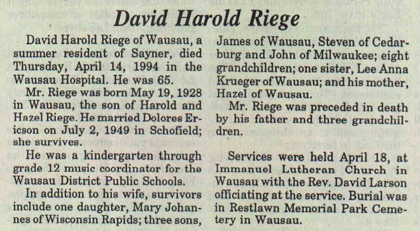 | Riege | David Harold | 19 May 1928 | 14 Apr 1994 | V N-R | 20 Apr 1994 | 4 |