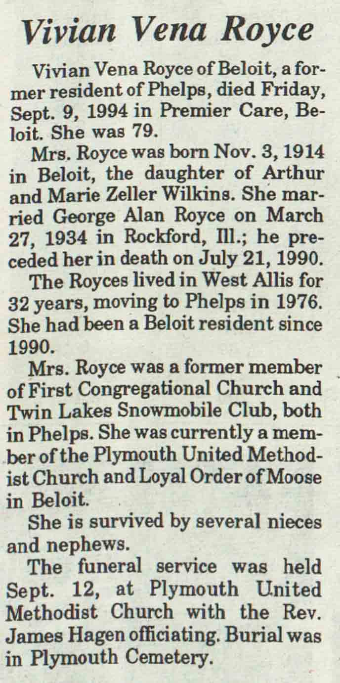 | Royce | Vivian Vena (Wilkins) | 03 Nov 1914 | 09 Sep 1994 | V N-R | 14 Sep 1994 | 4 |