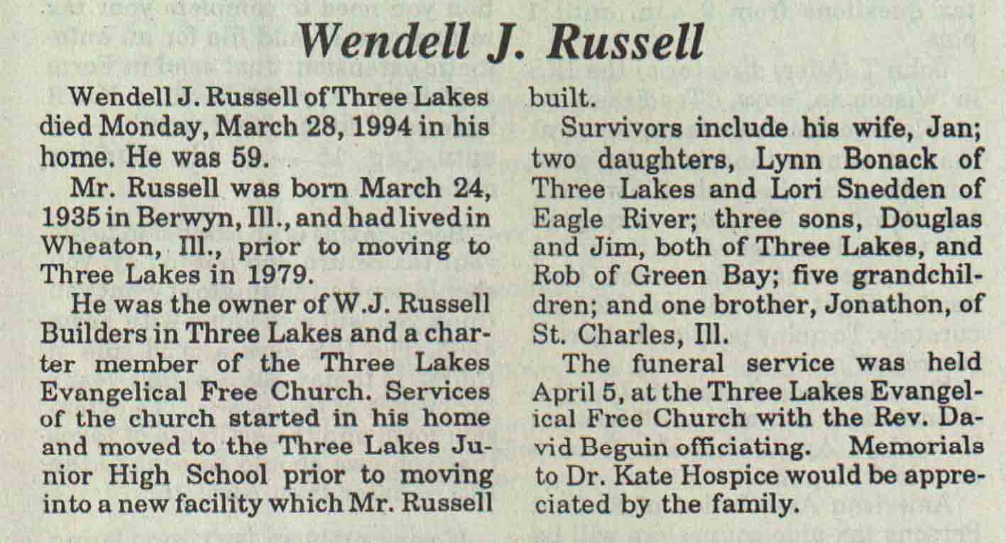 | Russell | Wendell J | 24 Mar 1935 | 28 Mar 1994 | V N-R | 06 Apr 1994 | 4 |