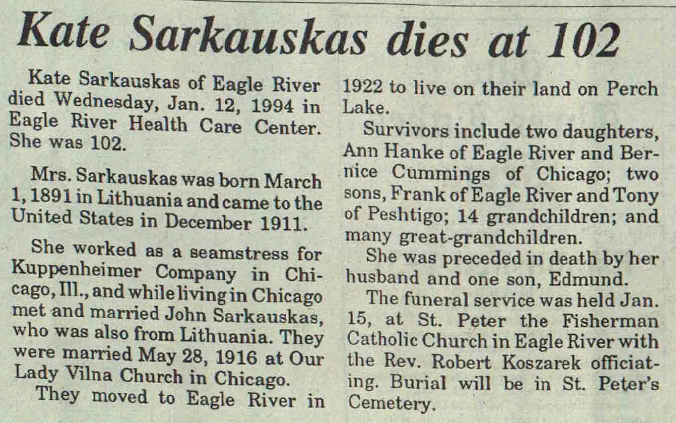 | Sarkauskas | Kate | 1 Mar 1899 | 12 Jan 1994 | V N-R | 19 Jan 1994 | 4 |