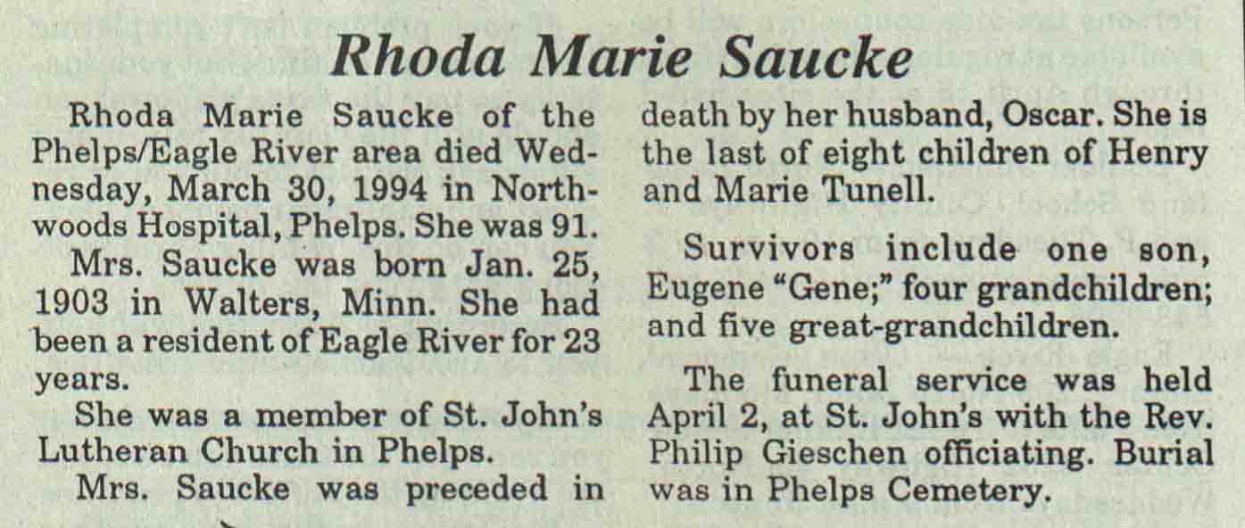 | Saucke | Rhoda Marie (Tunell) | 25 Jan 1903 | 30 Mar 1994 | V N-R | 06 Apr 1994 | 4 |