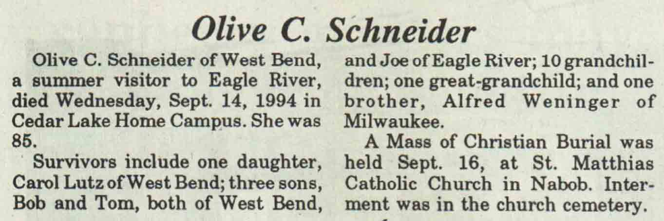 | Schneider | Olive C | c 1909 | 14 Sep 1994 | V N-R | 28 Sep 1994 | 4 |