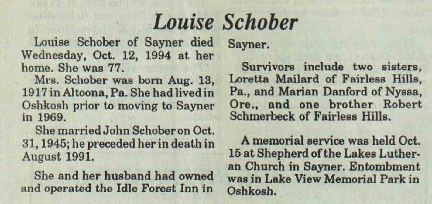 | Schober | Louise (Schmerbeck) | 13 Aug 1917 | 12 Oct 1994 | V N-R | 19 Oct 1994 | 4 |