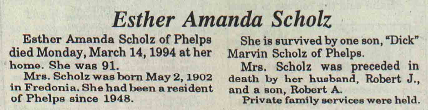 | Scholz | Esther Amanda | 02 May 1902 | 14 Mar 1994 | V N-R | 16 Mar 1994 | 4 |