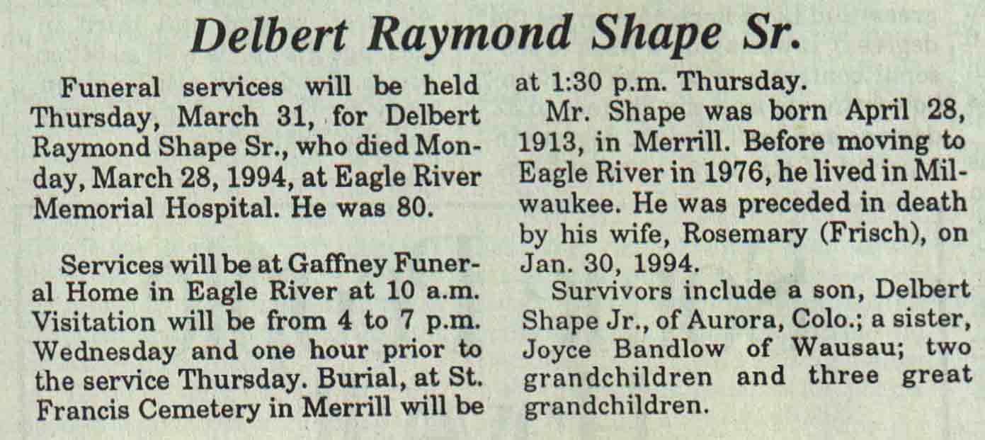 | Shape | Delbert Raymond, Sr | 28 Apr 1913 | 28 Mar 1994 | V N-R | 30 Mar 1994 | 4 |