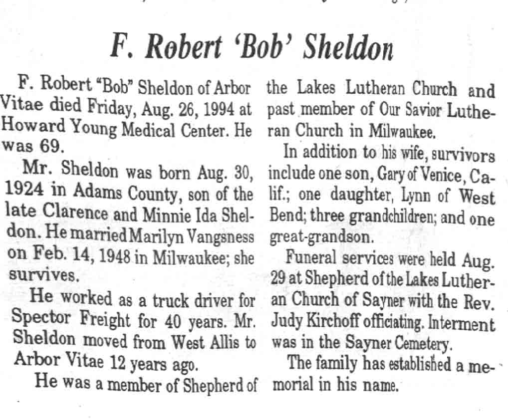 | Sheldon | F Robert 'Bob' | 30 Aug 1924 | 26 Aug 1994 | V N-R | 31 Aug 1994 | 4 |