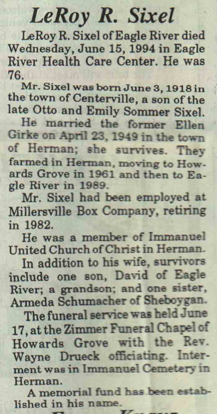 | Sixel | LeRoy R | 03 Jun 1918 | 15 Jun 1994 | V N-R | 22 Jun 1994 | 4 |