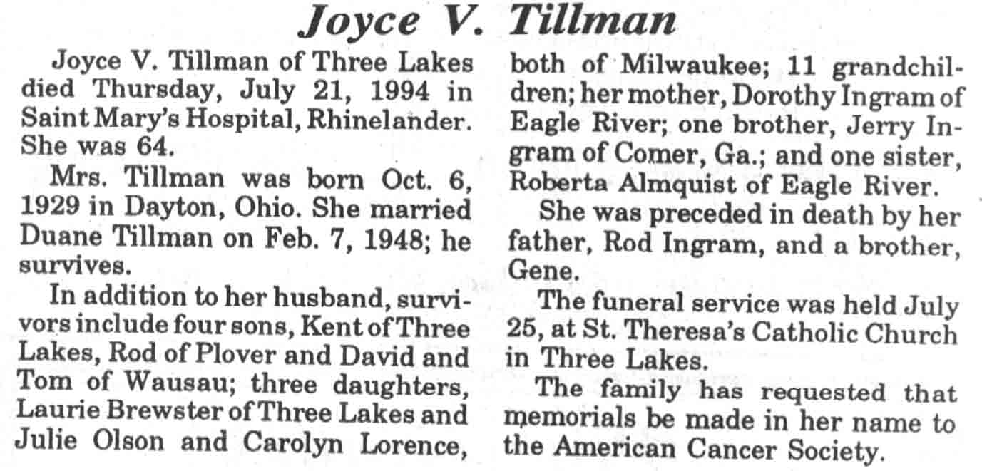 | Tillman | Joyce V (Ingram) | 29 Oct 1929 | 21 Jul 1994 | V N-R | 27 Jul 1994 | 4 |