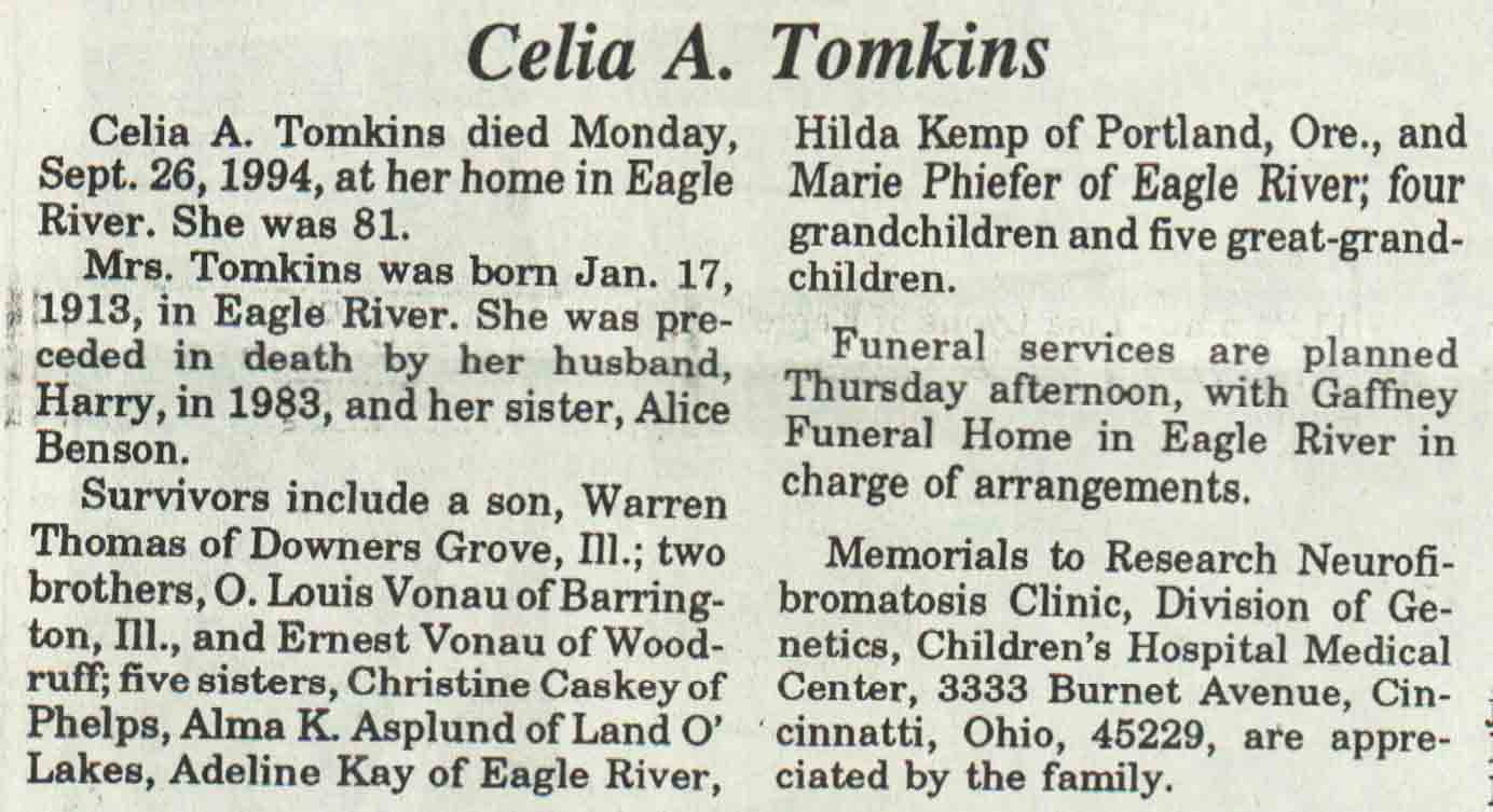 | Tomkins | Celia A (Vonau) | 17 Jan 1913 | 26 Sep 1994 | V N-R | 28 Sep 1994 | 4 |