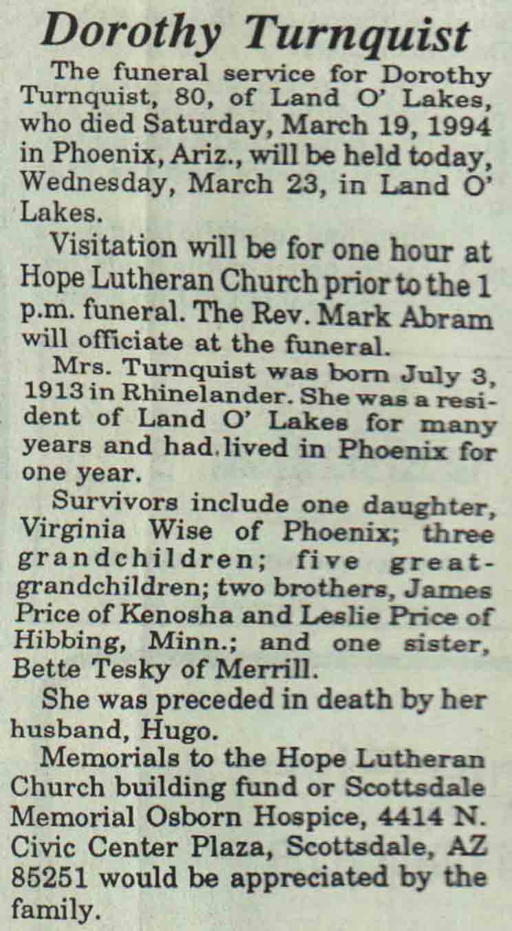 | Turnquist | Dorothy (Price) | 03 Jul 1913 | 19 Mar 1994 | V N-R | 23 Mar 1994 | 4 |