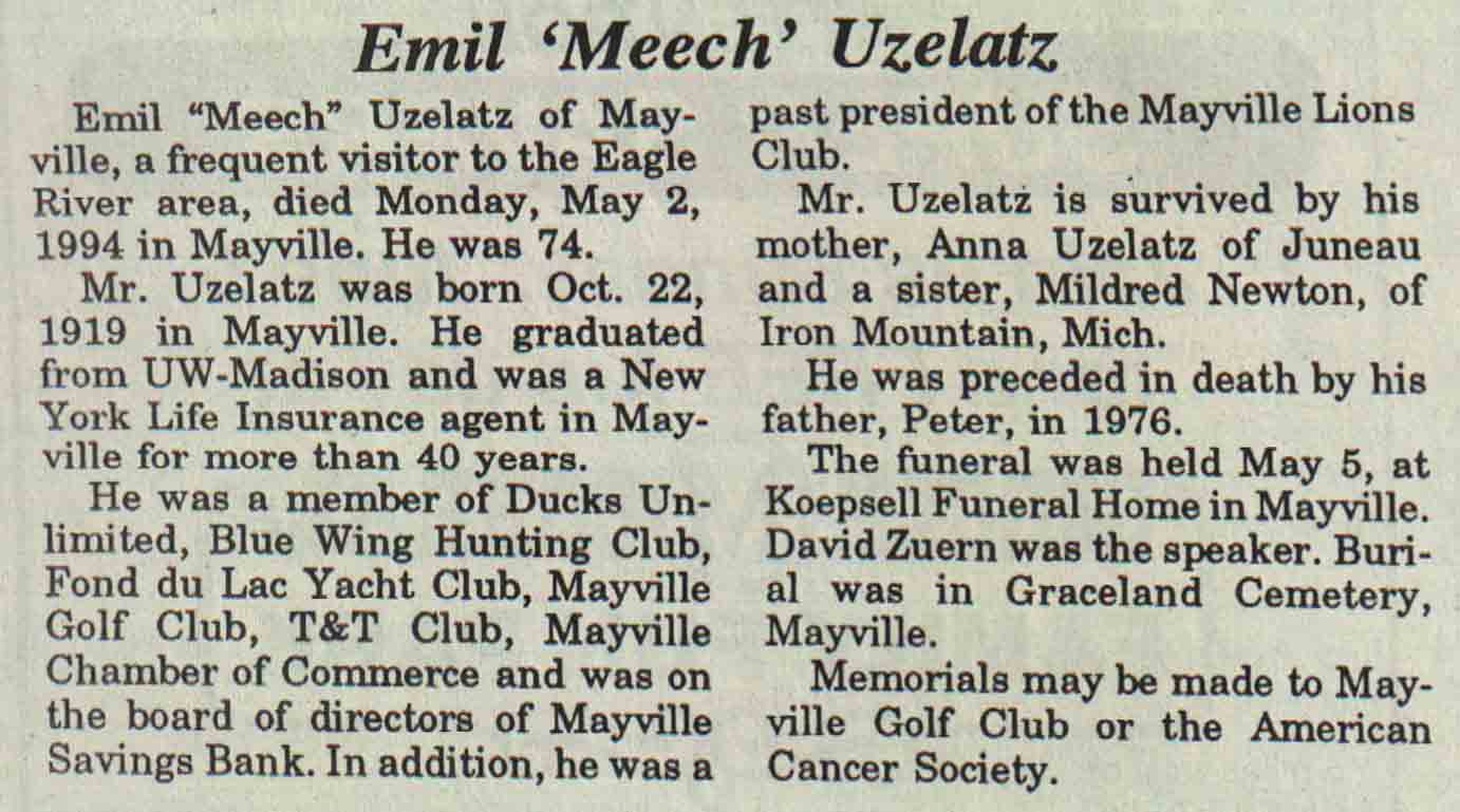 | Uzelatz | Emil 'Meech' | 22 Oct 1919 | 02 May 1994 | V N-R | 11 May 1994 | 4 |