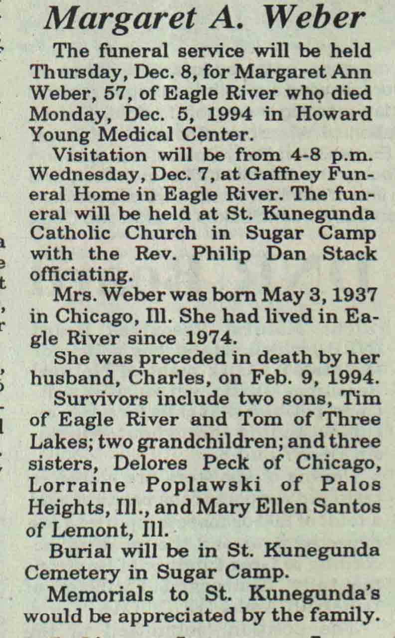 | Weber | Margaret A | 03 May 1937 | 05 Dec 1994 | V N-R | 07 Dec 1994 | 4 |