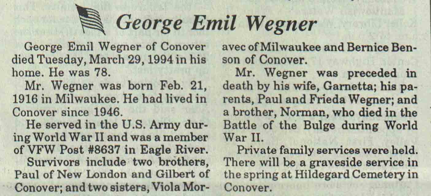 | Wegner | George Emil | 21 Feb 1916 | 29 Mar 1994 | V N-R | 06 Apr 1994 | 4 |