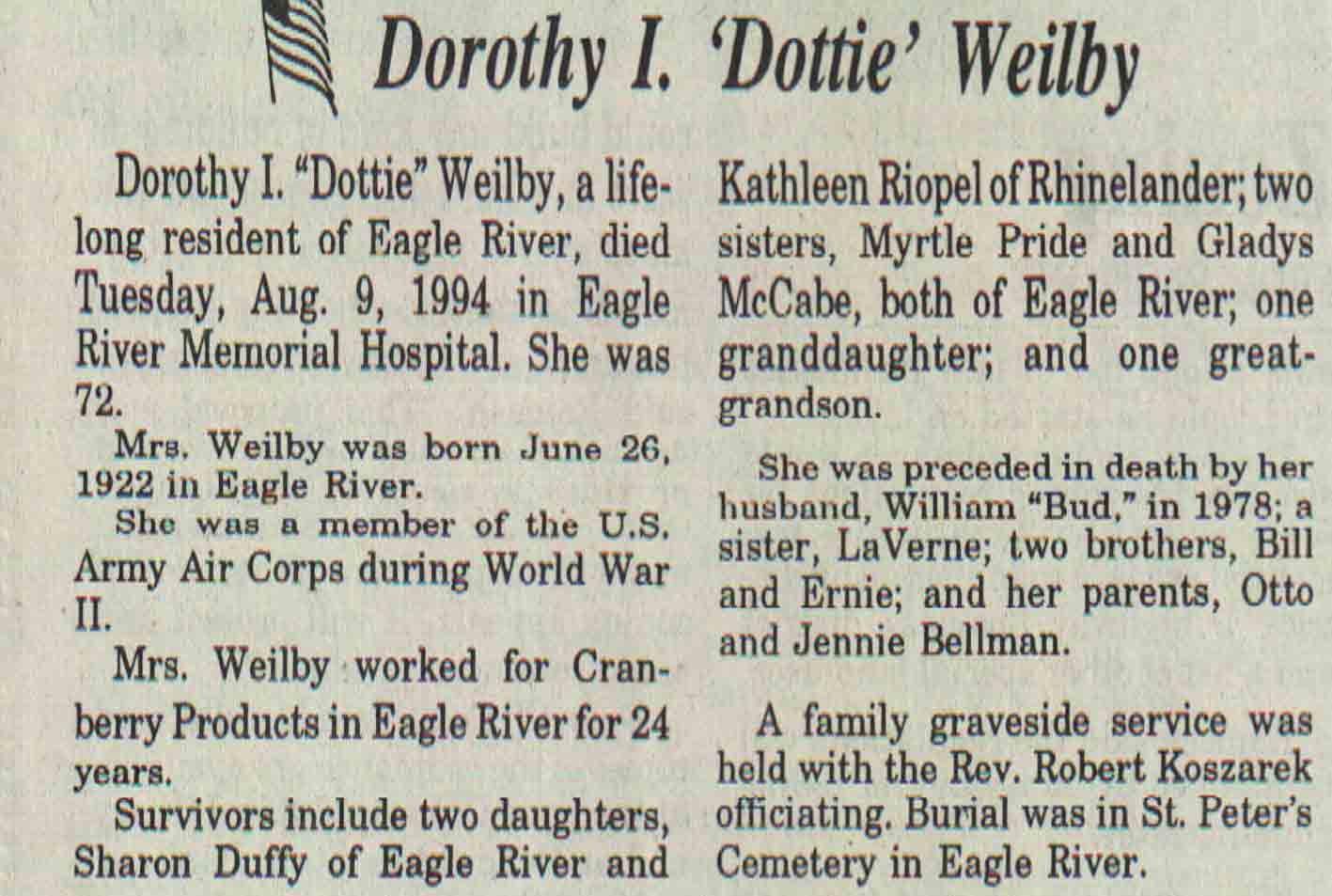 | Weilby | Dorothy I 'Dottie' (Bellman) | 26 Jan 1922 | 09 Aug 1994 | V N-R | 17 Aug 1994 | 4 |