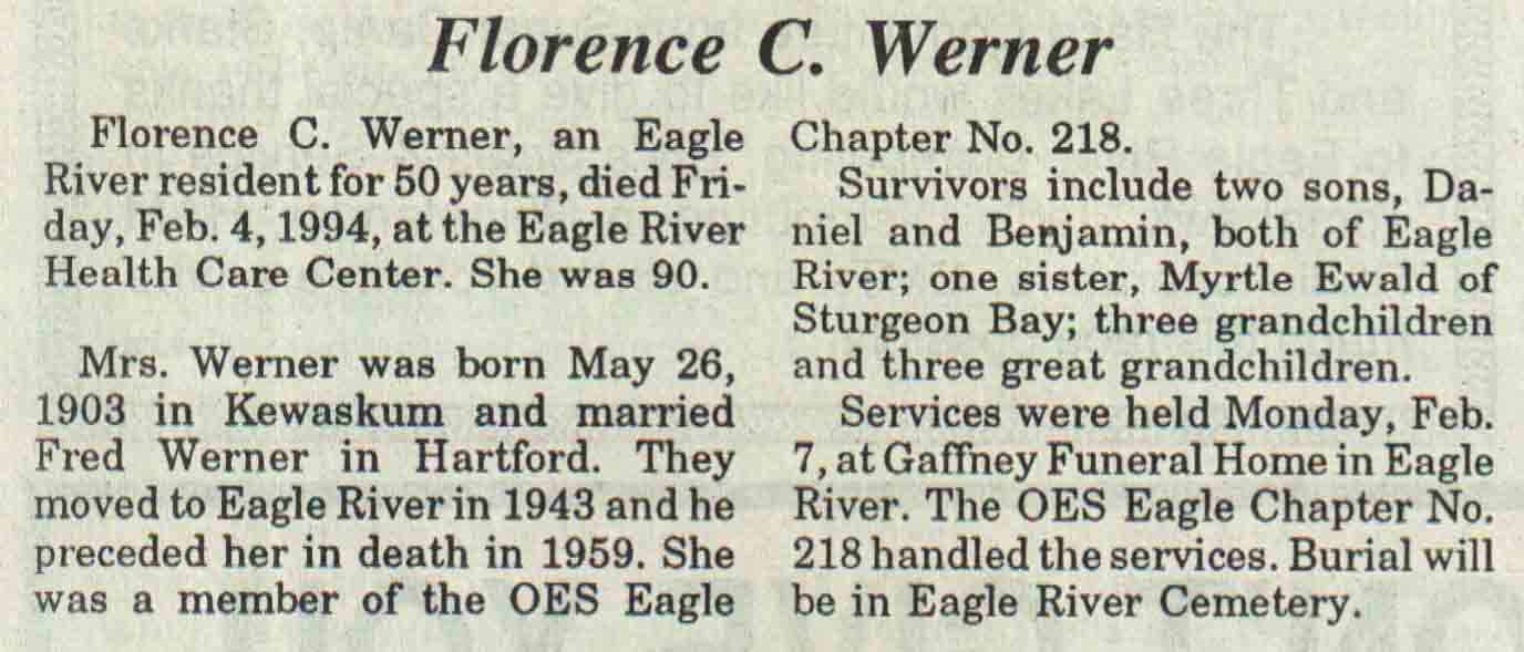 | Werner | Florence C | 26 May 1903 | 04 Feb 1994 | V N-R | 09 Feb 1994 | 4 |