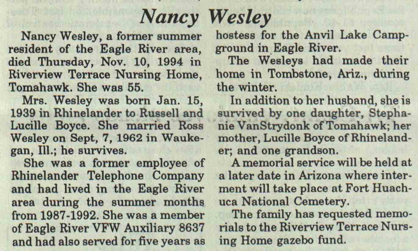 | Wesley | Nancy (Boyce) | 15 Jan 1939 | 10 Nov 1994 | V N-R | 16 Nov 1994 | 4 |