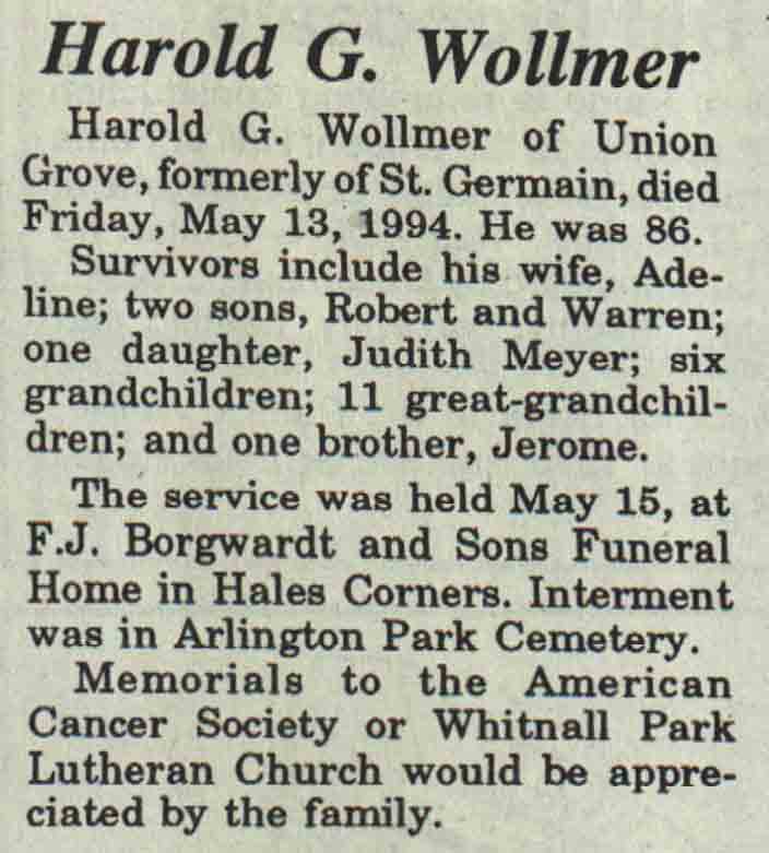| Wollmer | Harold G | c 1908 | 13 May 1994 | V N-R | 18 May 1994 | 4 |