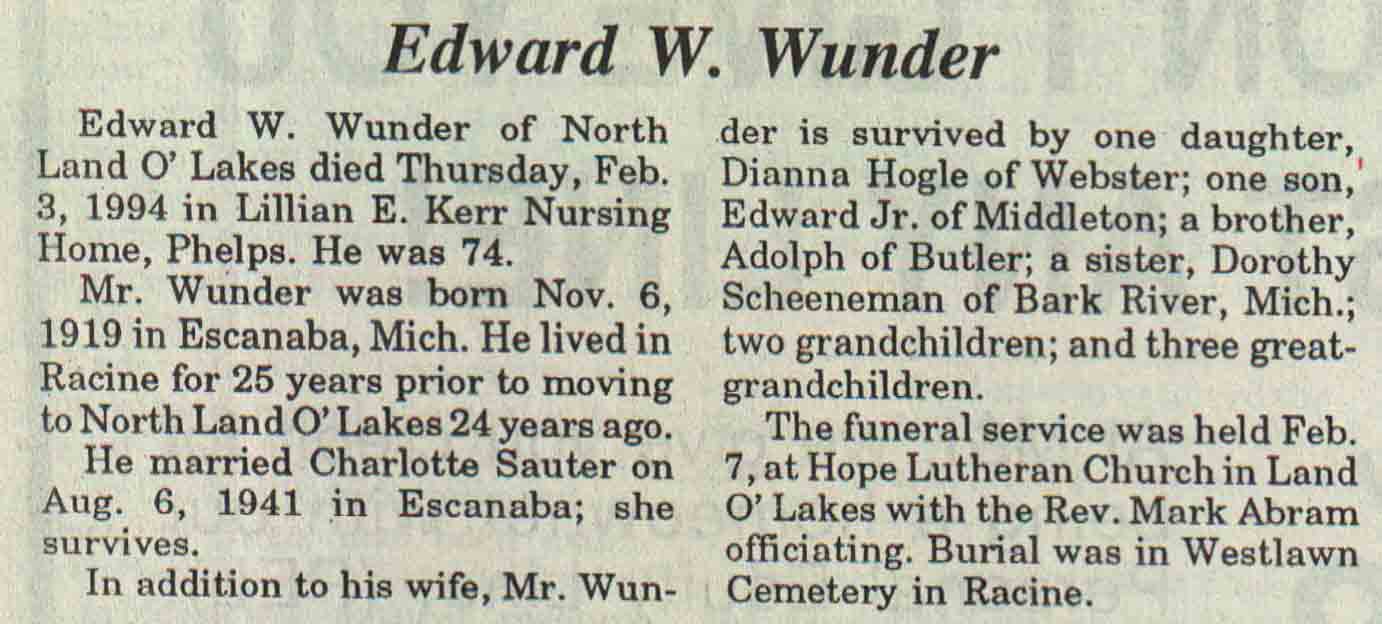 | Wunder | Edward W | 06 Nov 1919 | 03 Feb 1994 | V N-R | 09 Feb 1994 | 4 |