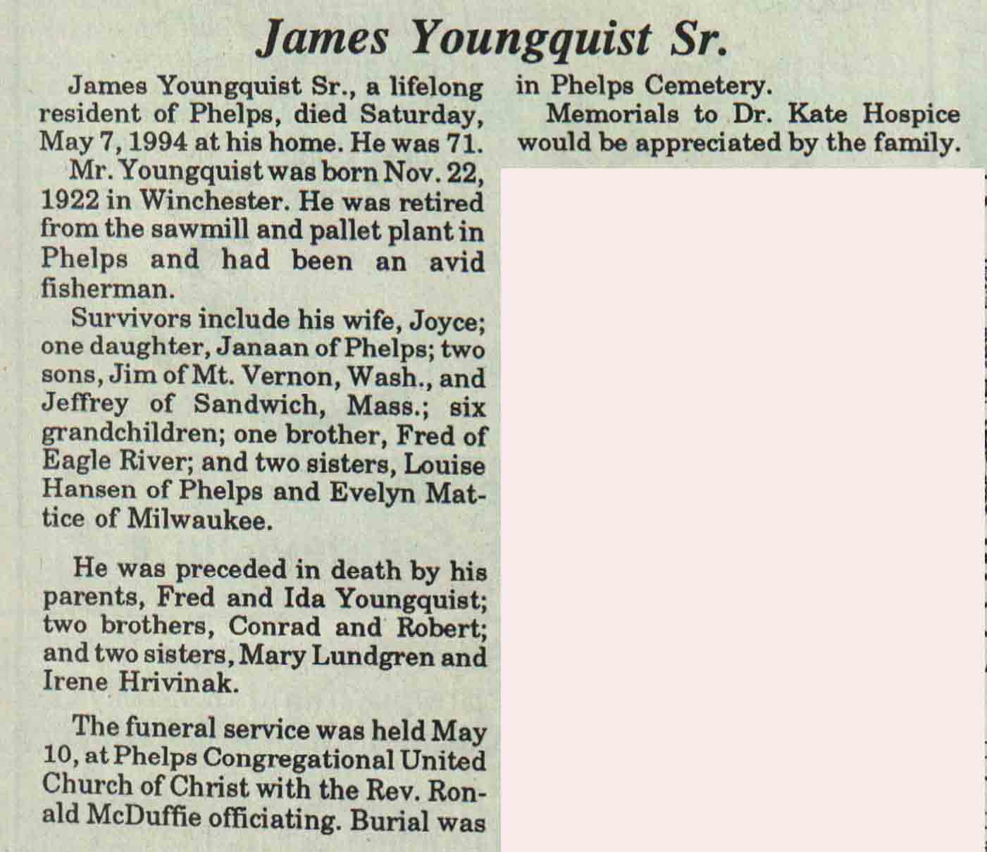 | Youngquist | James, Sr | 22 Nov 1922 | 07 May 1994 | V N-R | 11 May 1994 | 4 |