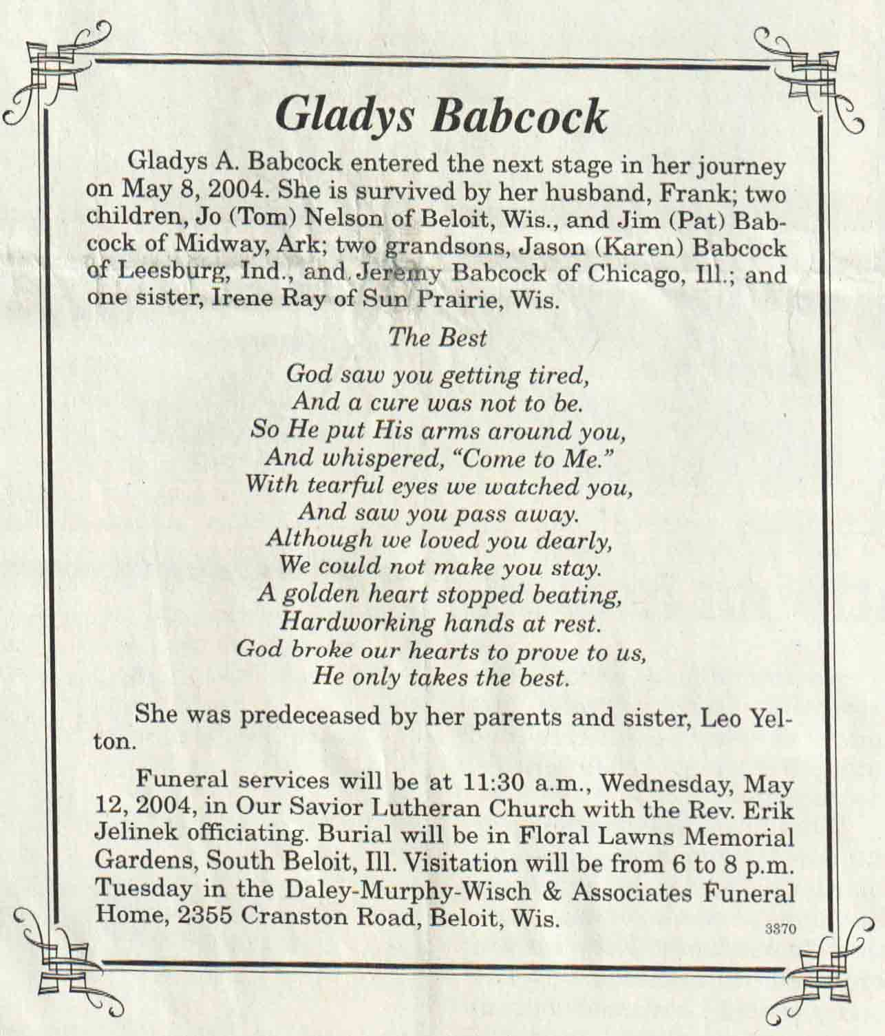 | Boguszewski | Eleanor N (Zolinski) | c 1920 | 25 Apr 2004 | V N-R | 05 May 2004 | 4A |