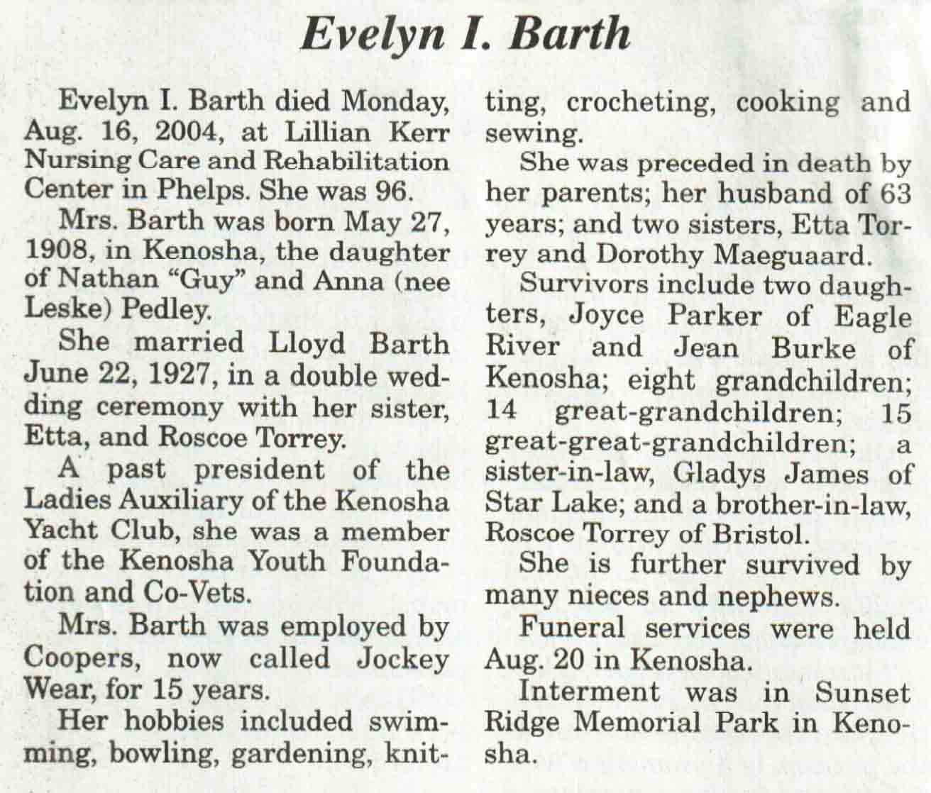 | Barth | Evelyn I (Pedley) | 27 May 1908 | 16 Aug 2004 | V N-R | 25 Aug 2004 | 4A |