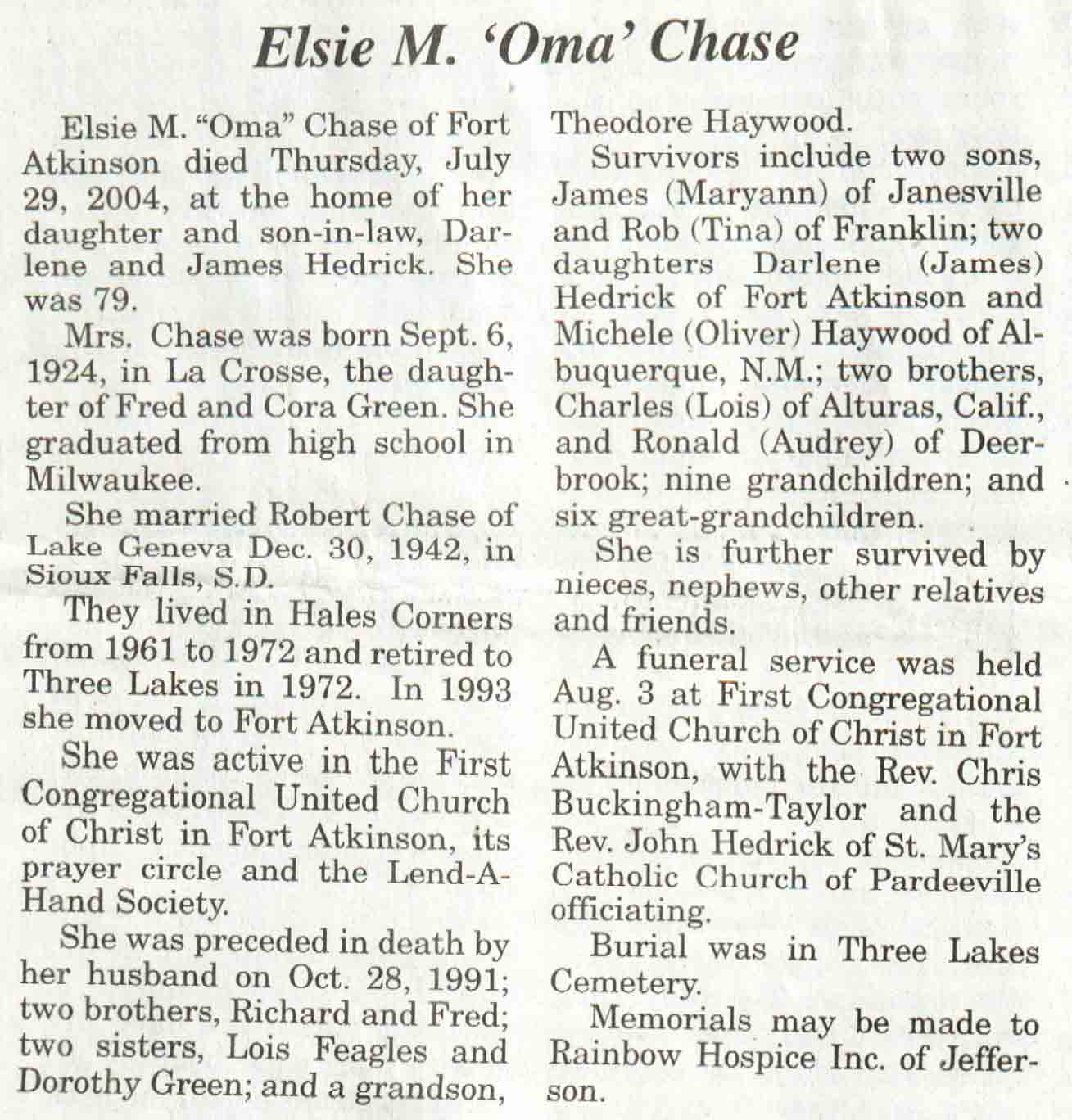 | Chase | Elsie M 'Oma' (Green) | 06 Sep 1924 | 29 Jul 2004 | V N-R | 04 Aug 2004 | 4A |