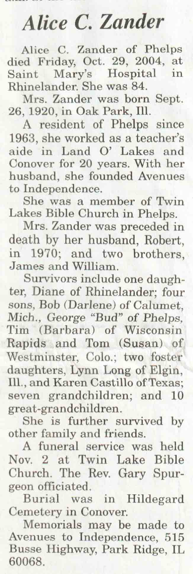 | Zander | Alice C | 26 Sep 1920 | 29 Oct 2004 | V N-R | 03 Nov 2004 | 4A |