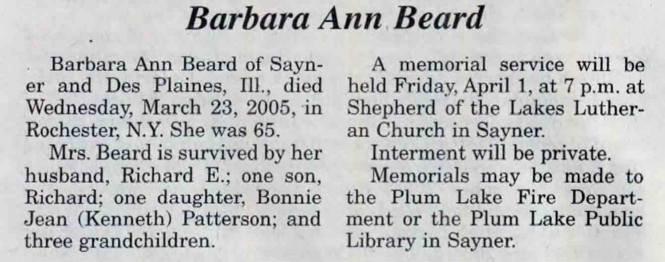 | Beard | Barbara Ann | c 1940 | 23 Mar 2005 | V N-R | 30 Mar 2005 | 4A |