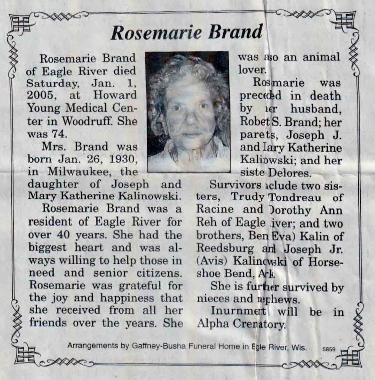 | Brand | Rosemarie (Kalinowski) | 26 Jan 1930 | 01 Jan 2005 | V N-R | 05 Jan 2005 | 4A |
