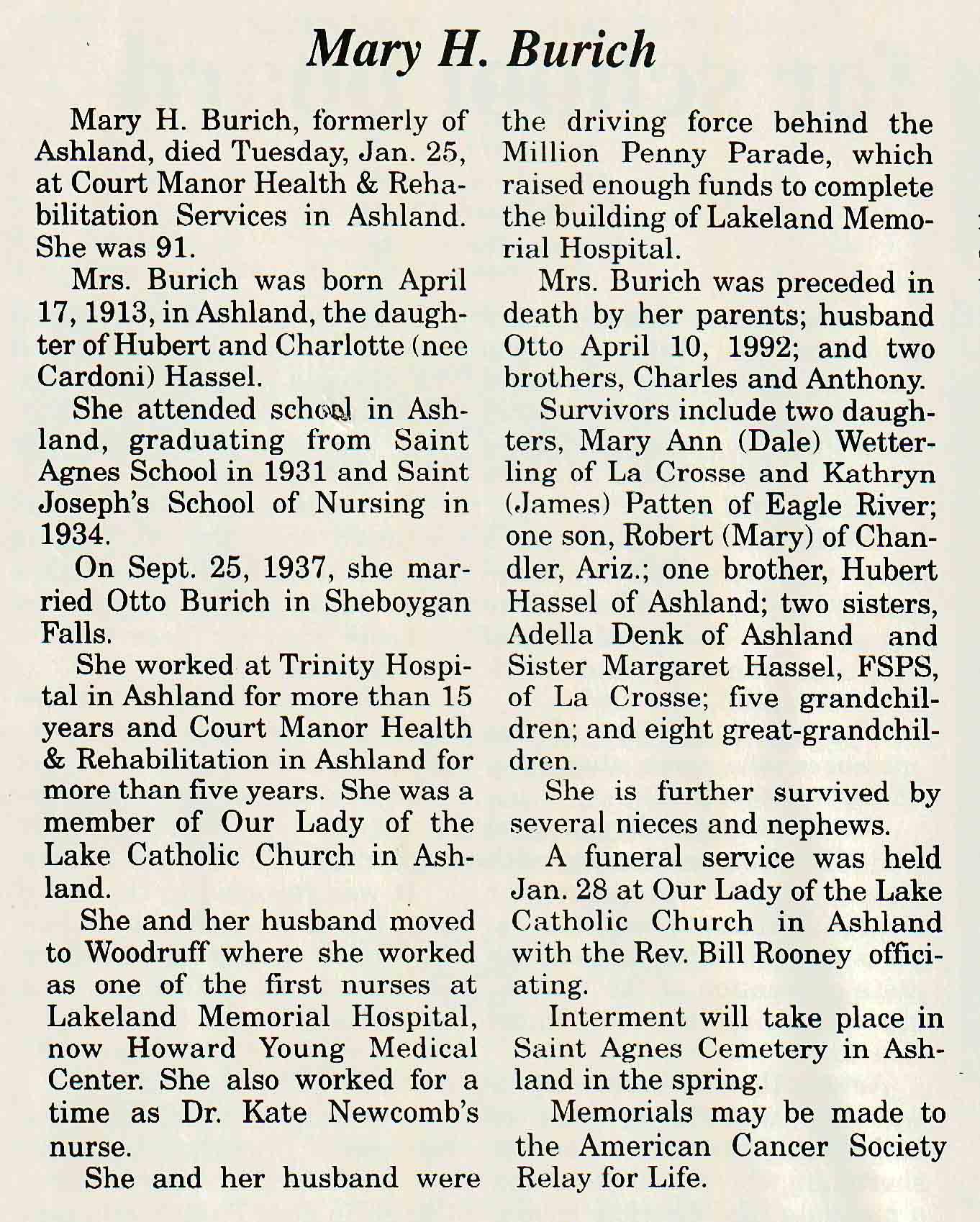 | Burich | Mary H (Hassel) | 17 Apr 1913 | 25 Jan 2005 | V N-R | 02 Feb 2005 | 4A |