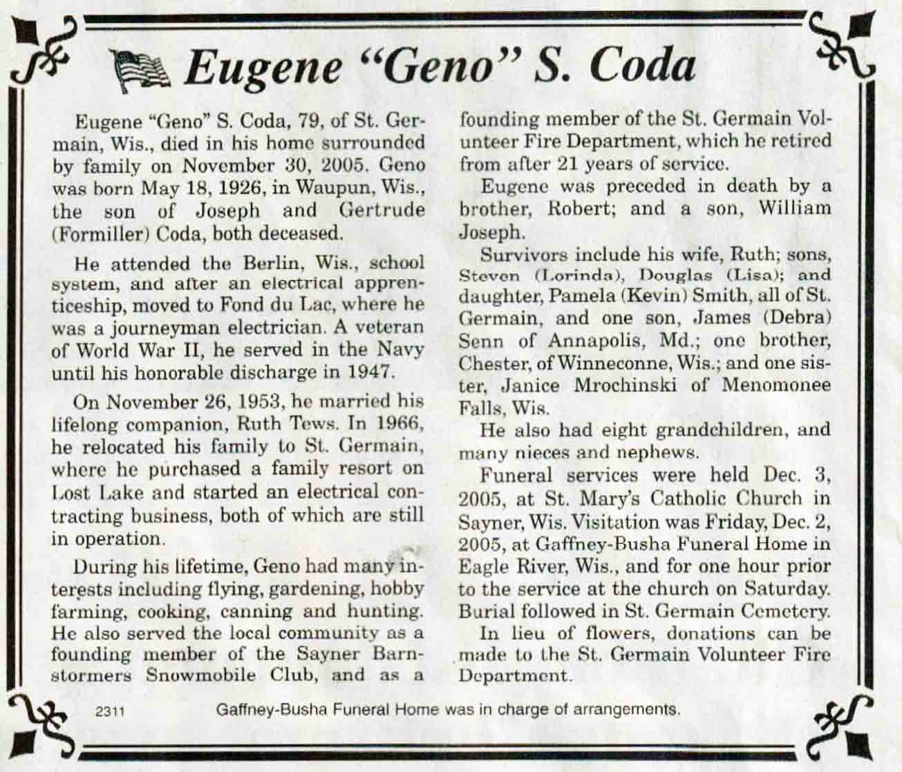 | Coda | Eugene S 'Geno' | 18 May 1926 | 30 Nov 2005 | V N-R | 07 Dec 2005 | 4A |