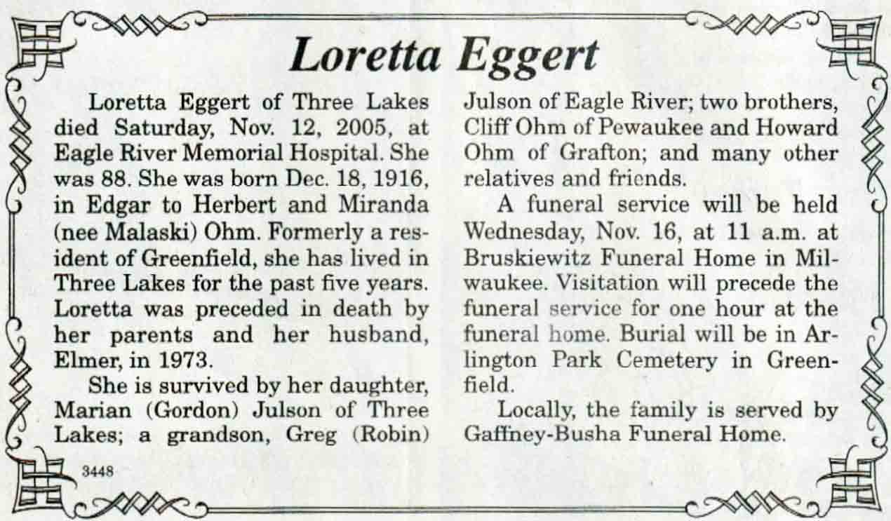 | Eggert | Loretta (Ohm) | 18 Dec 1916 | 12 Nov 2005 | V N-R | 16 Nov 2005 | 4A |