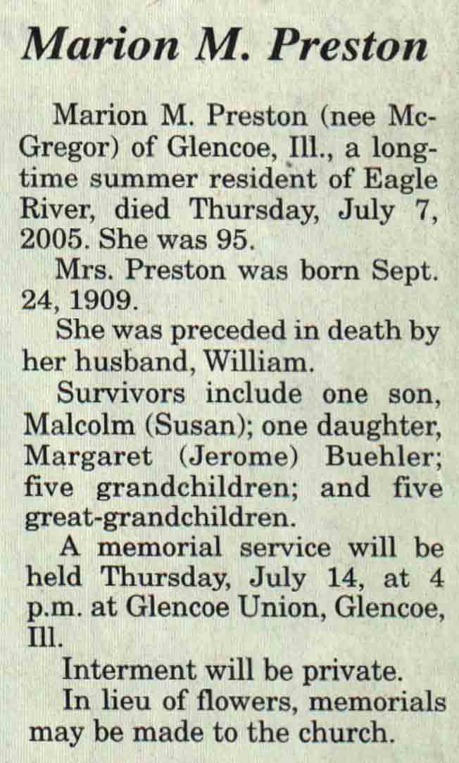 | Preston | Marion M (McGregor) | 24 Sep 1909 | 07 Jul 2005 | V N-R | 13 Jul 2005 | 4A |