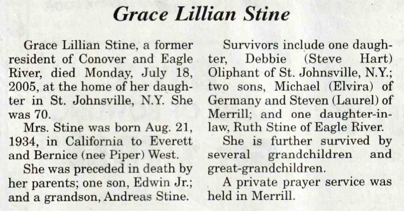 | Stine | Grace Lillian (west) | 21 Aug 1934 | 18 Jul 2005 | V N-R | 03 Aug 2005 | 4A |