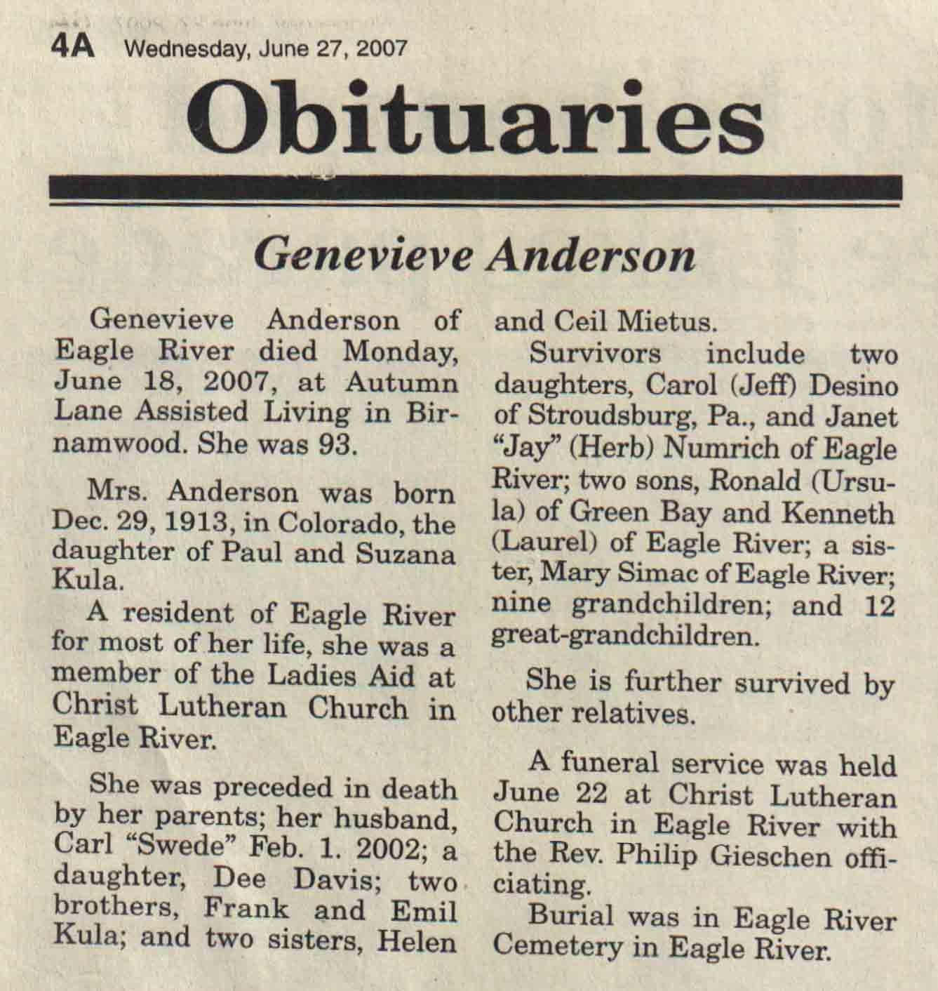 | Anderson | Genevieve | 29 Dec 1913 | 18 Jun 2007 | V N-R | 20 Jun 2007 | 4A |