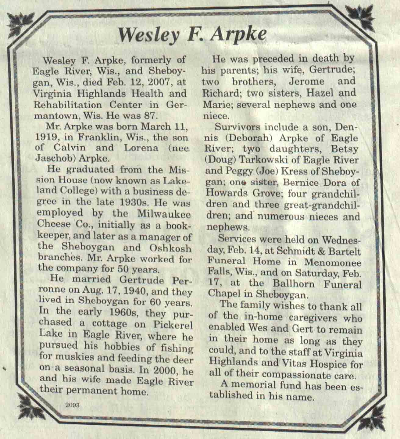 | Arpke | Wesley F | 11 Mar 1919 | 12 Feb 2007 | V N-R | 14 Feb 2007 | 4A |