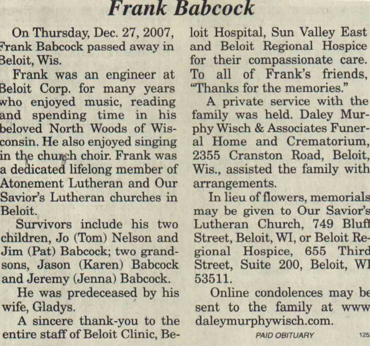 | Babcock | Frank | 27 Dec 2007 | V N-R | 16 Jan 2008 | 6A |
