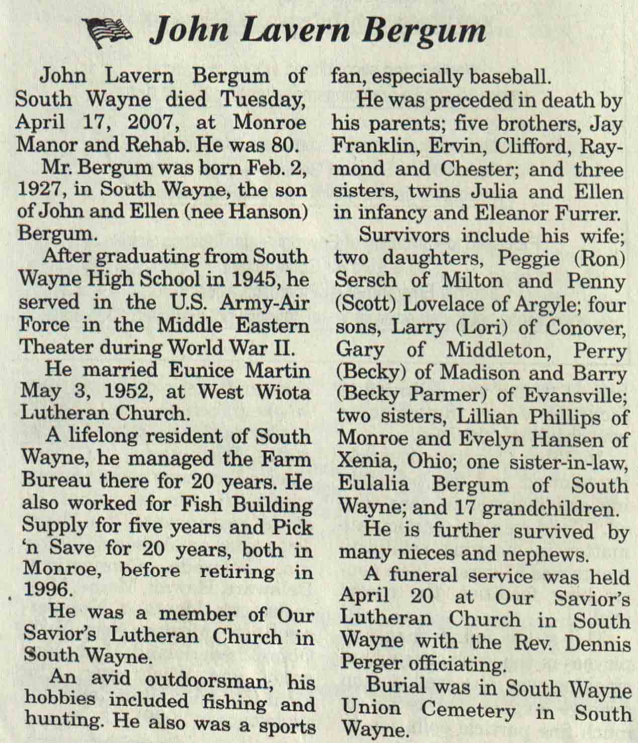 | Bergum | John Lavern | 02 Feb 1927 | 17 Apr 2007 | V N-R | 25 Apr 2007 | 4A |