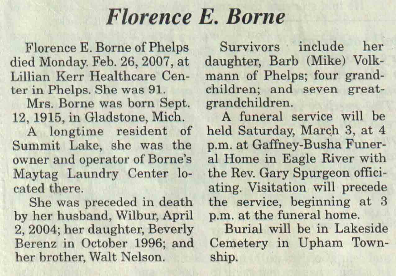 | Borne | Florence E | 12 Sep 1915 | 26 Feb 2007 | V N-R | 28 Feb 2007 | 4A |