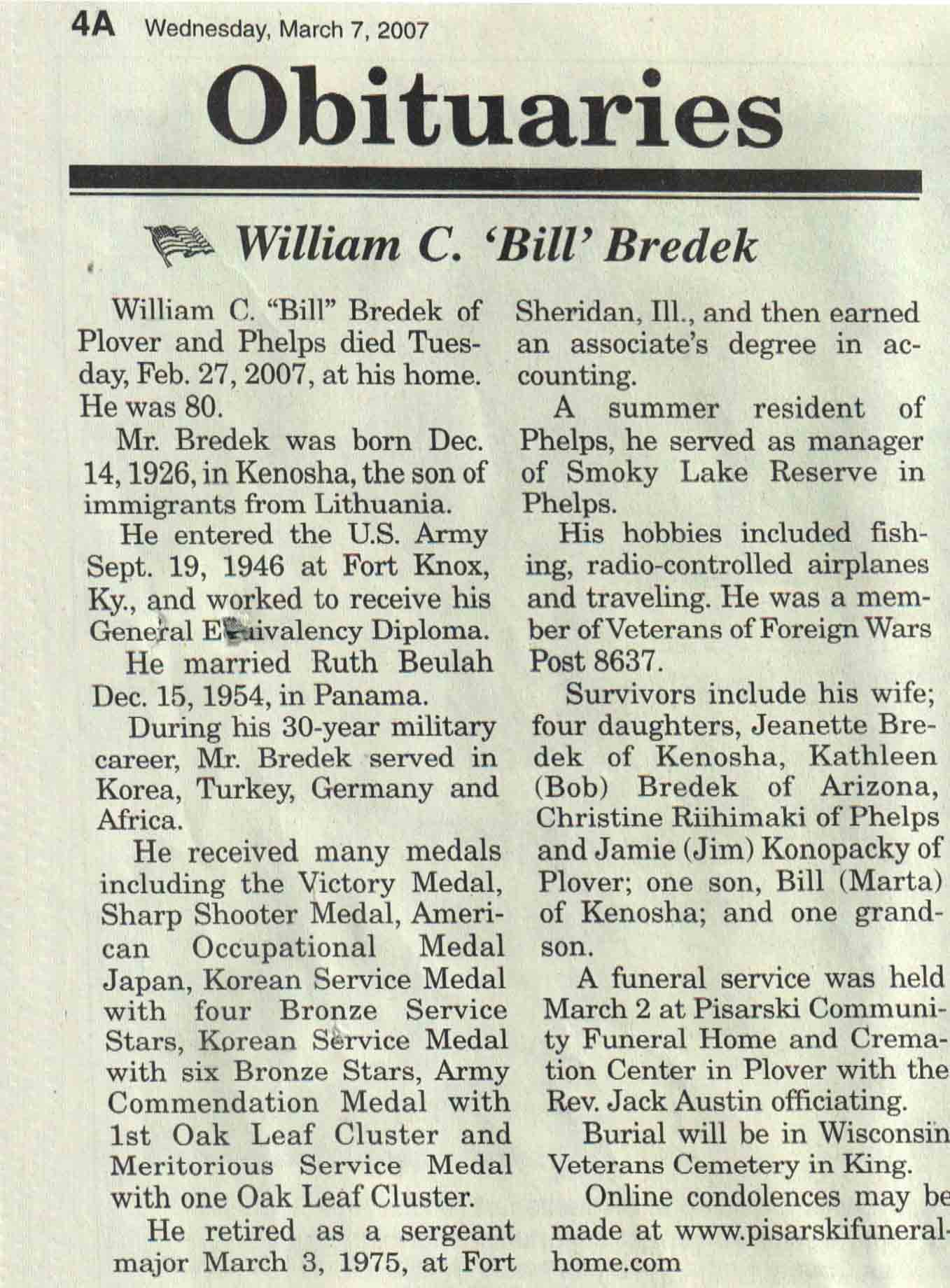 | Bredek | William C 'Bill' | 14 Dec 1926 | 27 Feb 2007 | V N-R | 07 Mar 2007 | 4A |