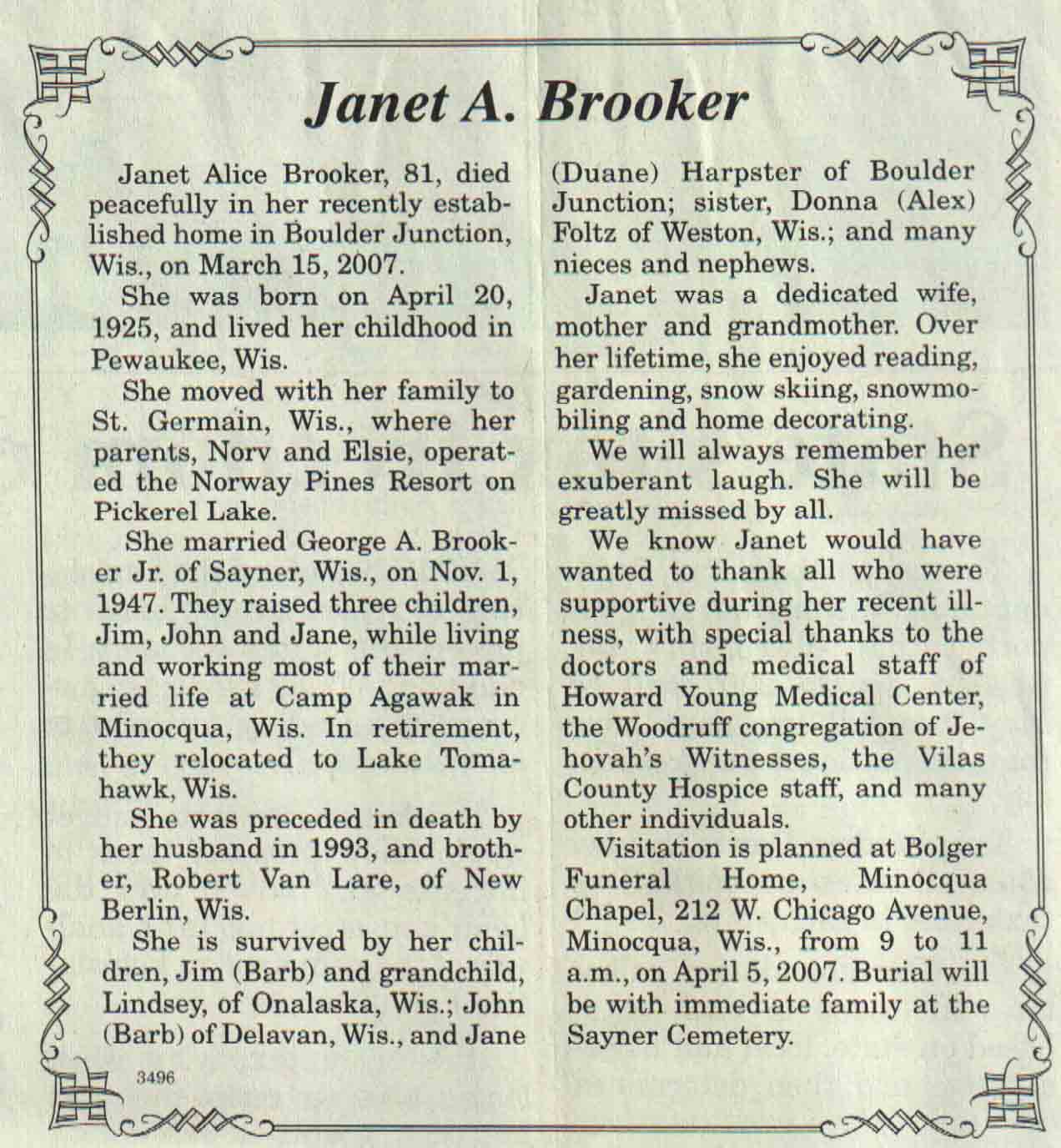 | Brooker | Janet A | 20 Apr 1925 | 15 Mar 2007 | V N-R | 04 Apr 2007 | 4A |