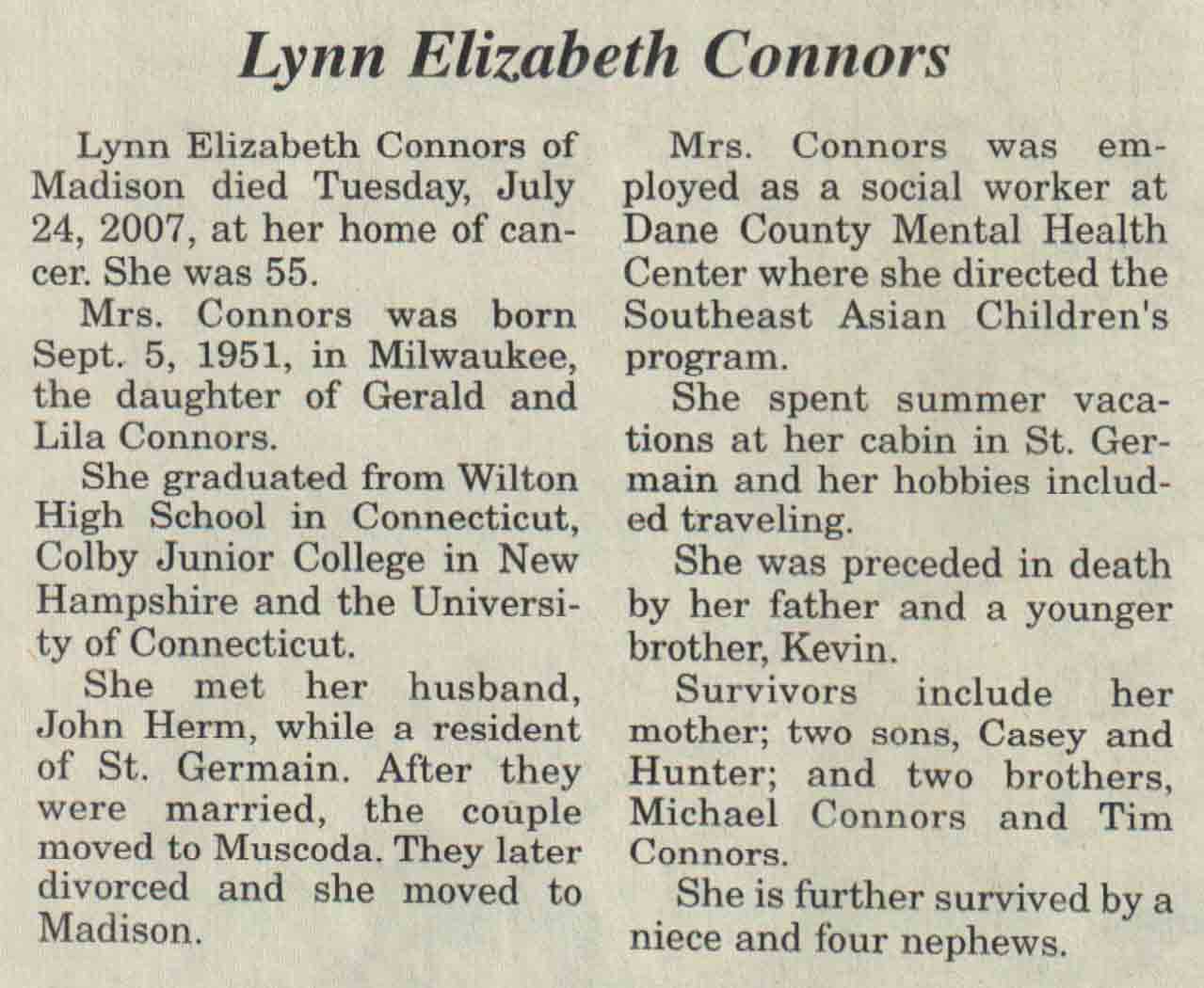 | Connors | Lynn Elizabeth | 05 Sep 1951 | 24 Jul 2007 | V N-R | 01 Aug 2007 | 4A |